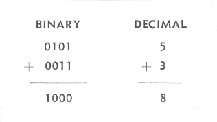 Suppose that you have four separate on-off components (switches, tubes, etc.), each of which is assumed to indicate zero when OFF and 1 when ON. Table I shows how the two states of these same four devices can be employed to express various decimal numbers. In order better to understand this table, let us consider the basic rules of binary addition which may be stated as follows: 0 + 0 = 0, 0 + 1 = 1, 1 + 0 = 1, and 1 + 1 = 10. This last sum means simply that every time 1 is added to 1, we write down zero and carry the 1 to the next column to the left. An illustration will serve to clarify binary addition. For serve to clarify binary addition. For example, from Table I add 0101 (binary 5) and 0011 (binary 3):