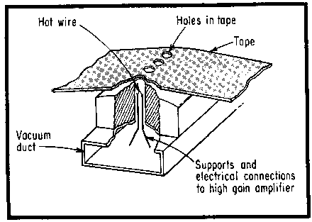 current. When hole in tape opens, air flow changes wire temperature,