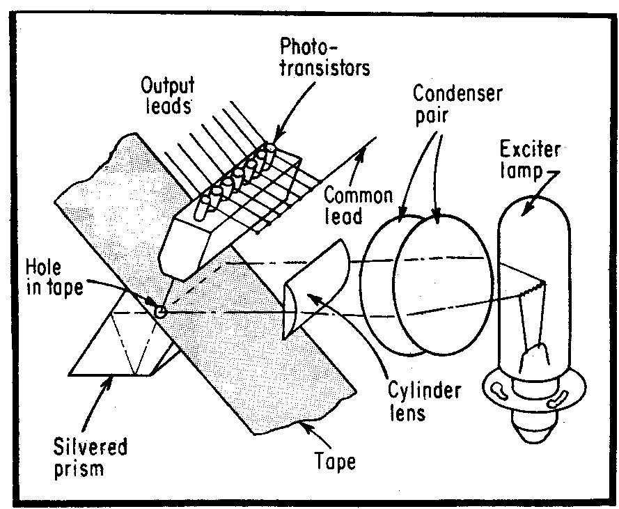 A silvered prism behind the punched tape reflects light from the