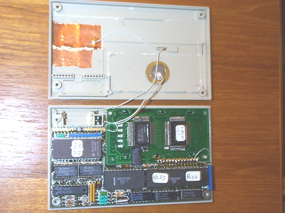 This is a handheld data device powered by four Energizer A76 and two Duracell D364 coin cell batteries. On the back it has what looks to be two 7-pin connectors. The hand-written label on the EPROM has a 1985 date. The device contains:
