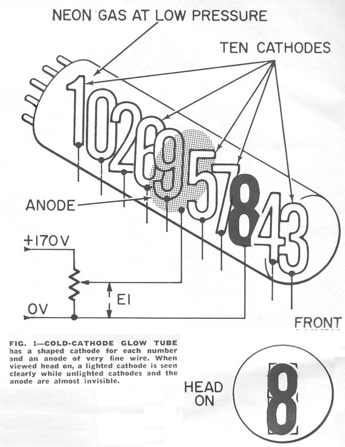 The typical Nixie is a cold-cathode gas glow tube that has an anode and ten cathodes, as in Fig. 1. (Variations, including tubes with plus sign and minus sign, are also available). Each cathode has an activated surface that allows it to emit electrons readily. Connect a voltage source to the anode and to any one cathode - leave the others open - and raise the voltage slowly. At a relatively low voltage the cathode will begin to glow over a small portion of its surface. Continue raising the voltage and the glow will spread until the whole cathode is lit and a number - 0 through 9 depending on which cathode you latched on to - will be clearly visible, even from many feet away.